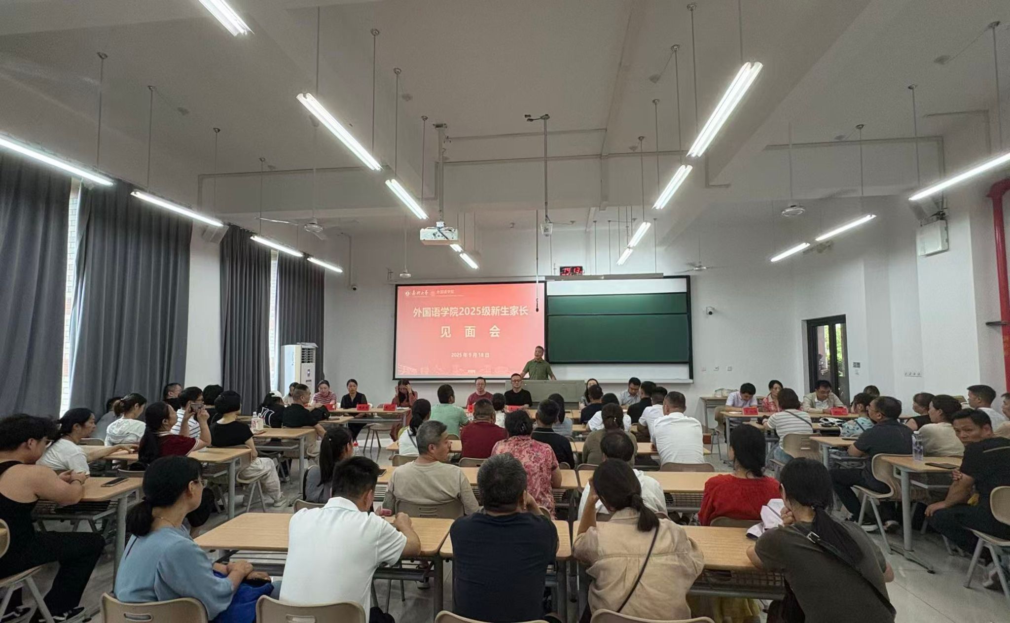 9月18日下午,外国语学院在兴德楼南楼123会议室举行2025级新生家长见面会。学院党政领导班子成员、各系主任、2025级新生班主任、辅导员与新生家长共聚一堂,共商家校协同育人。见面会由学院党委副书记张啸峰主持。
