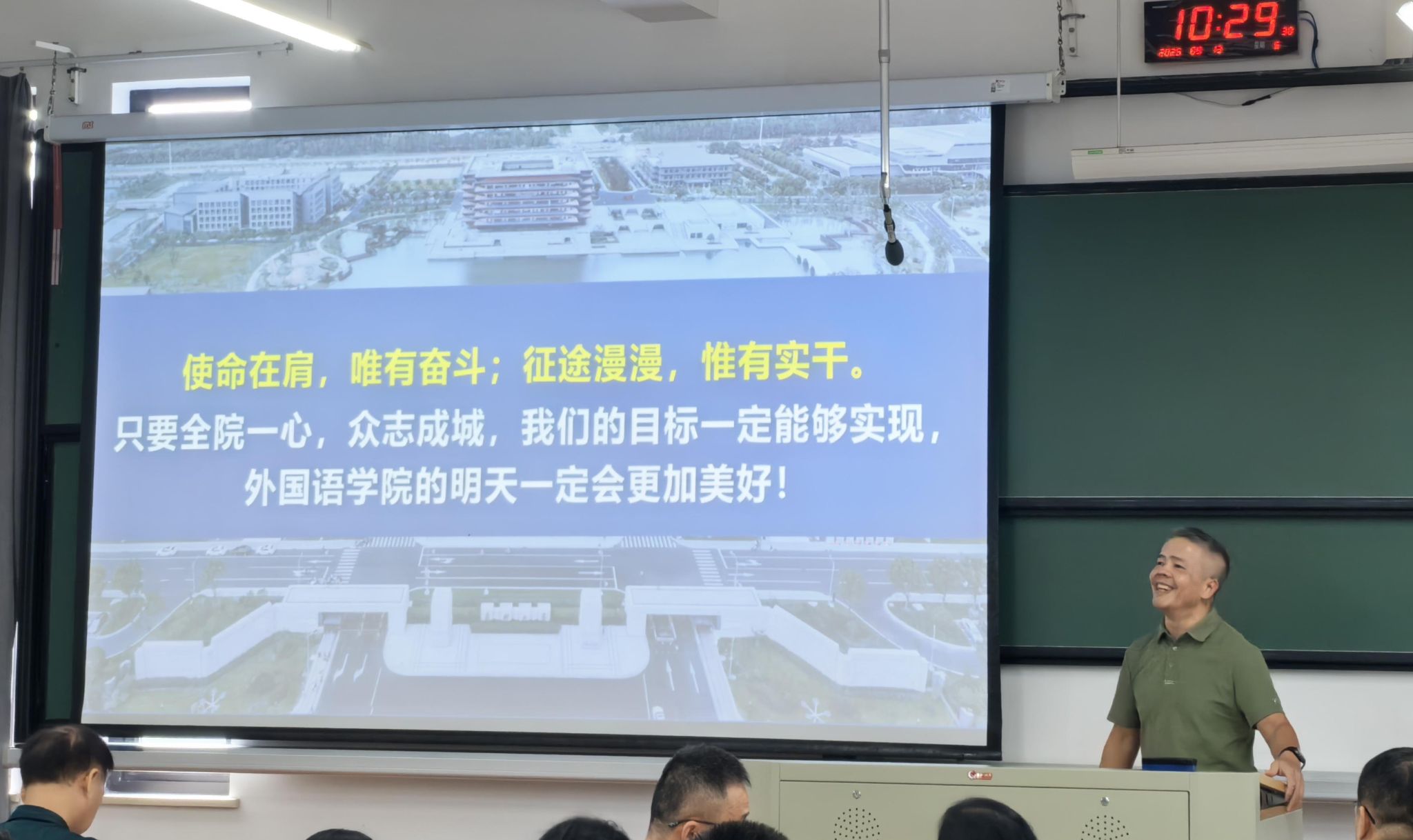 9月13日上午,外国语学院在兴德楼南楼205教室举行秋季学期全体教职工大会暨“教师开学第一课”。会议由院长唐艳芳主持,学院党政班子成员及全体教职工参加。